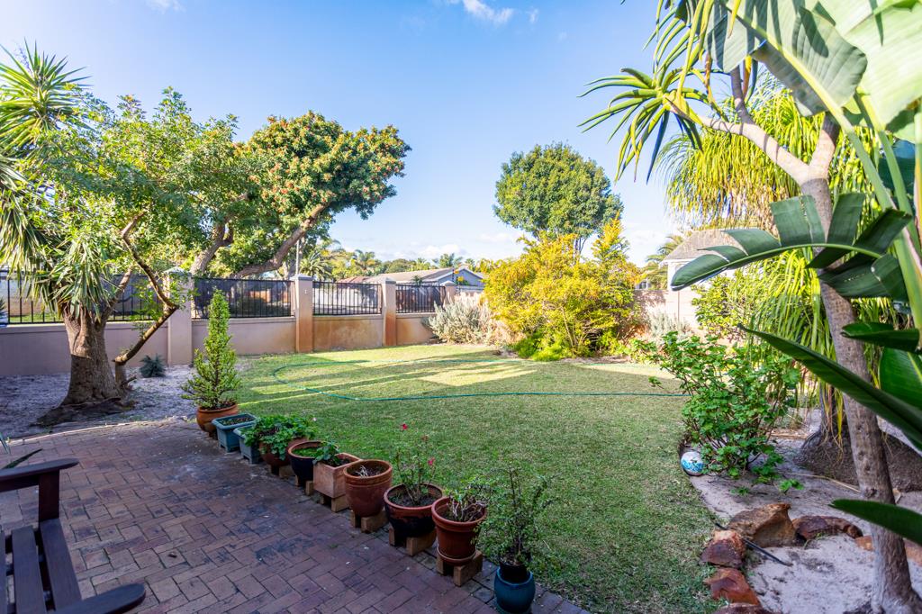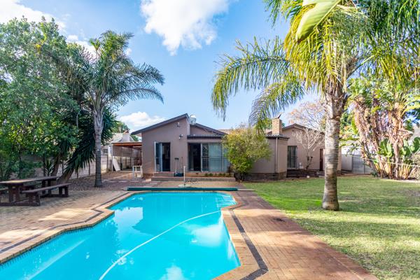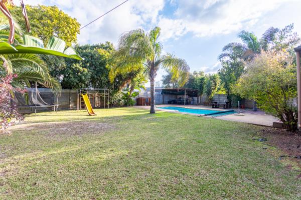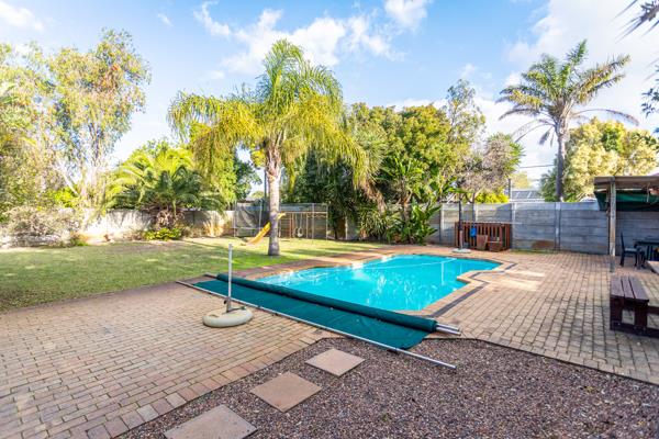 An undercover patio leads to a sparkling swimming pool and expansive garden ideal for children, pets, and weekend braais.