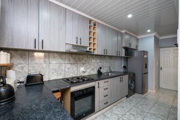The property features an inviting open-plan lounge and kitchen area, creating a warm and functional space perfect for everyday living. The kitchen features built-in cupboards, an under-counter oven and heated hob, one plumbing point, and space for a fridge.