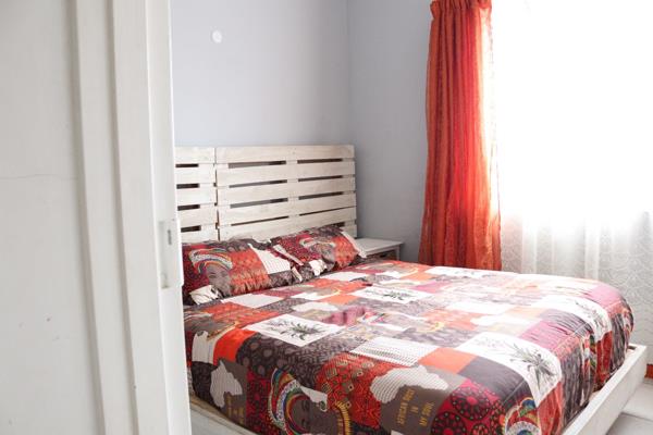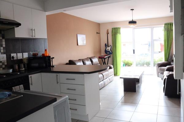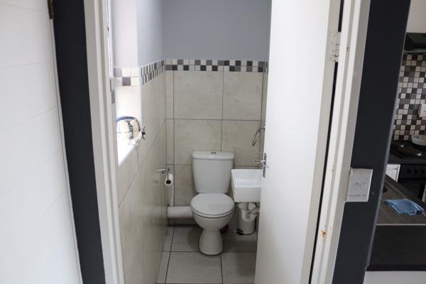 Inside the apartment, you will find an open-plan lounge and fully fitted kitchen bathed in natural light. The lounge features tiled flooring and a sliding door that opens up to the patio. The delightful kitchen is equipped with light wood cupboards, an under-counter oven and hob, a plumbing point, and a convenient breakfast countertop. Just adjacent to the kitchen, you will find the guest toilet.