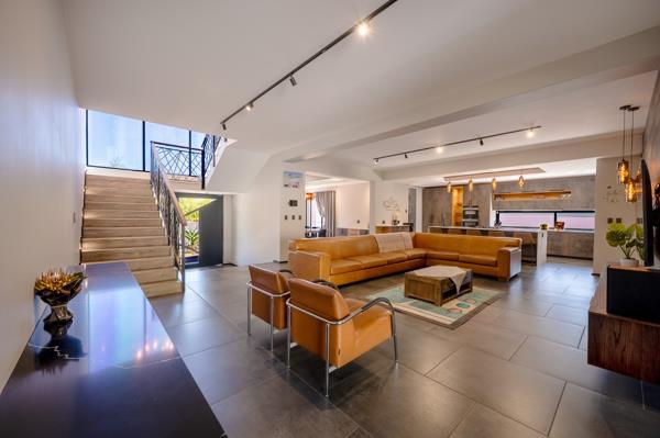 A dedicated entertainment space offers a built-in braai and stacker doors leading to the pool and back garden. The picturesque garden is filled with greenery and a stunning swimming pool. Added extras include an inverter system, solar panels, water tanks, a borehole, and a camera system for added security. In addition, the property boasts a double garage with parking for 4 vehicles and an automated access gate.