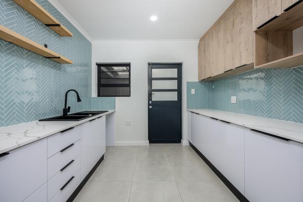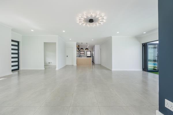 The fully fitted kitchen flows seamlessly into the open-plan dining area, lounge and braai room, where stacker doors open onto a beautifully landscaped yard and sparkling swimming pool, creating the perfect indoor-outdoor living experience.