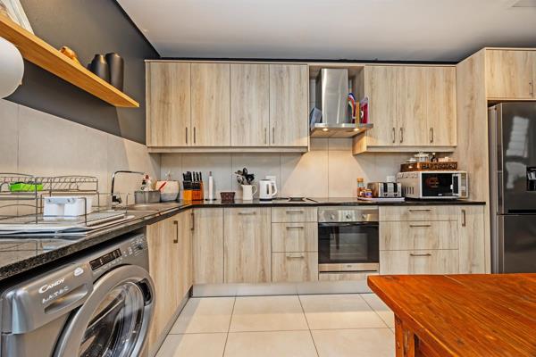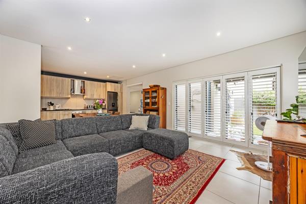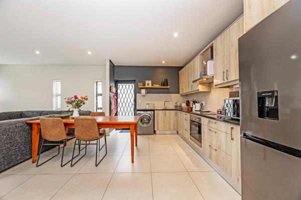 The heart of the home is the open-plan lounge and kitchen, creating a seamless flow that encourages easy everyday living and effortless entertaining. The kitchen is well-appointed with built-in cupboards, providing practical storage and workspace while remaining connected to the living area. Large stacker doors open from the lounge onto an outdoor braai area and garden, extending the living space outdoors. This inviting area is ideal for hosting friends, enjoying weekend braais, or simply relaxing while overlooking the garden.