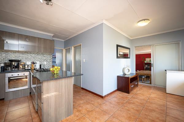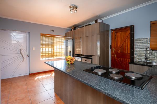 The home features a welcoming lounge and dining room with a cosy fireplace, perfect for those cooler evenings. With ample space for a 6-seater dining room table, this space creates an ideal setting for family meals and gatherings. The modern, well-appointed kitchen has ample cupboard space, two water points, an under-counter oven and hob as well as room for a double-door fridge.