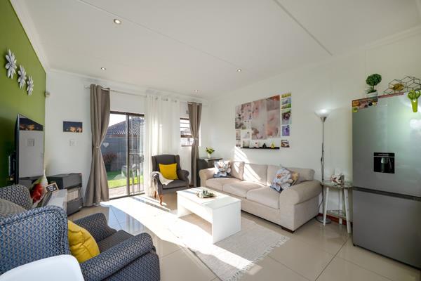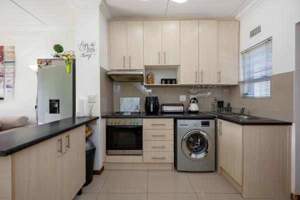 Upon entering, you are greeted by a spacious open-plan lounge and a fully fitted kitchen, both beautifully finished with sleek tiled flooring. The modern kitchen is equipped with light wood cupboards, an under-counter oven and hob, a plumbing point, and a stylish breakfast counter thats perfect for casual dining or entertaining guests. The lounge flows effortlessly through a sliding door into the enclosed backyard, creating a warm and inviting atmosphere ideal for both relaxation and gatherings.