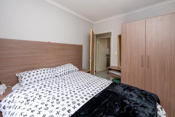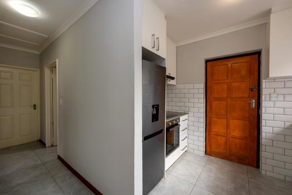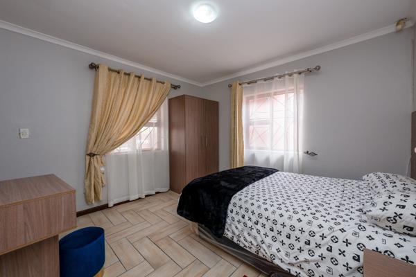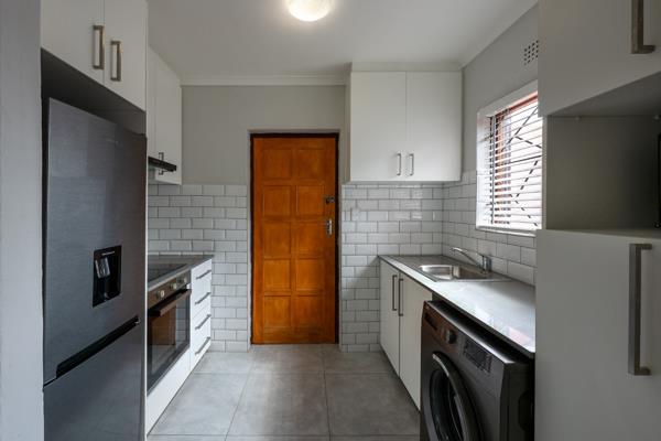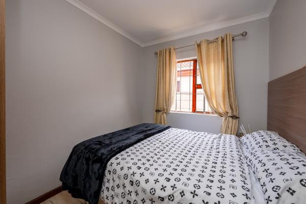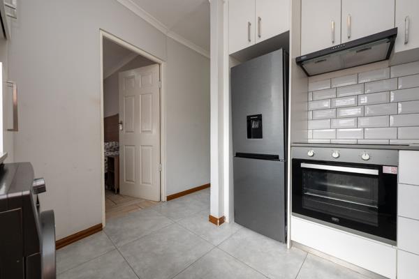 A stylish, modern kitchen forms the heart of the home, fitted with light wood cupboards, one plumbing point, a fitted stove and oven, and space for a fridge. The property features three generously sized bedrooms. The lounge has been converted into a fourth bedroom but can easily be reverted to its original use as a living area. The full bathroom is neat and contemporary, complete with a bathtub, a showerhead, a basin, and a toilet.