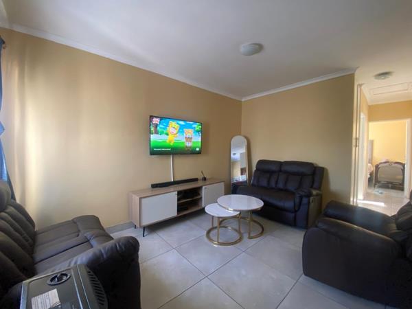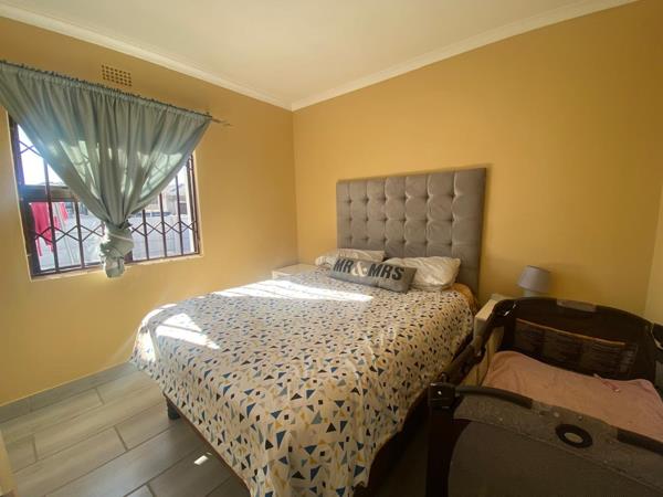 The home offers three bedrooms, including a spacious main bedroom with built-in cupboards. The fully tiled bathroom is equipped with a bath, shower over the bath, basin, and toilet.