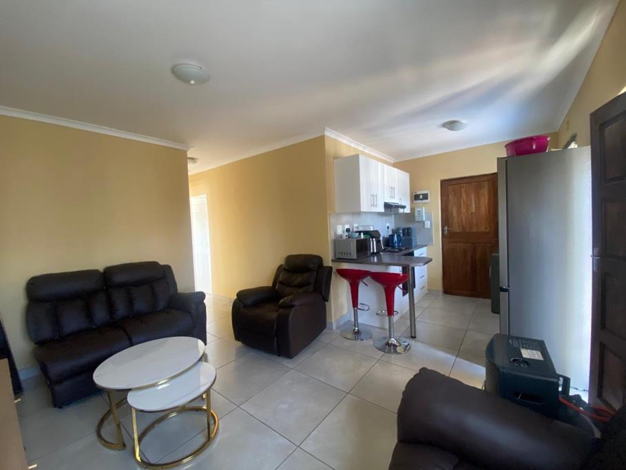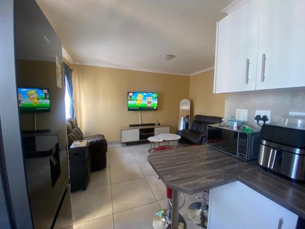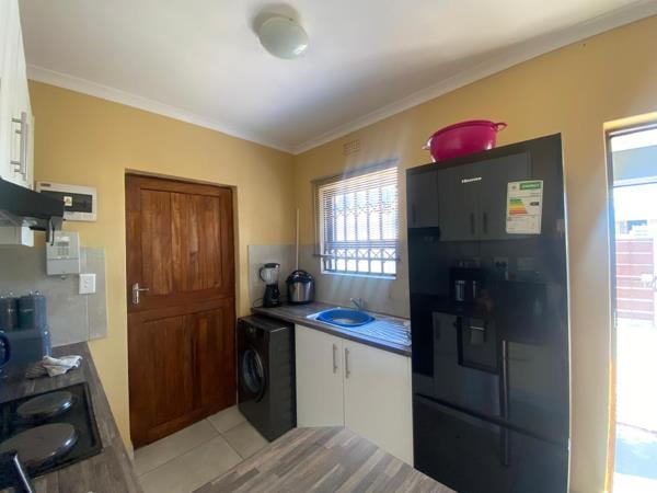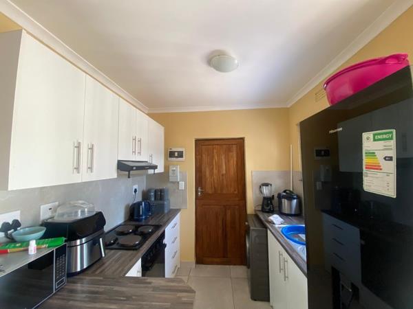 This lovely home boasts an open-plan lounge and kitchen area, perfectly designed for modern living. The kitchen features built-in cupboards, under-counter oven, stove top, and hob.