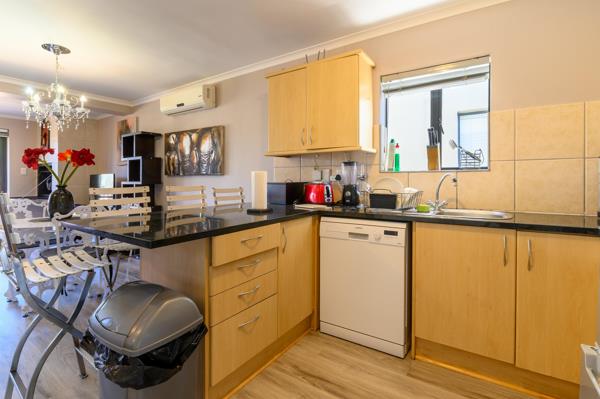 Entrance hall, guest WC, lounge and dining room with open plan kitchen, laundry and mini garage (golf cart , storage etc). Lovely small garden. Upstairs are two bedroom and a full bathroom plus a fantastic balcony with views across the golf course with Table Mountain and Blouberg Hill in the background. Hear and smell the ocean! Walking distance to beach, shops, public transport and restaurants.
