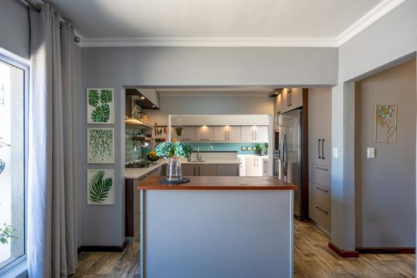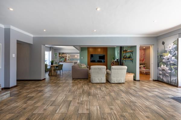 The main home features an expansive lounge, dining area and entertainment room with stylish flooring, a built-in braai and stacker doors that open onto the back garden, complete with a retractable awning and swimming pool. A cosy indoor fireplace enhances the lounge, which flows seamlessly into the modernised kitchen fitted with ample cupboard space, quartz countertops, a gas hob, oven and space for a double-door fridge. Adjacent to the kitchen is a well-appointed laundry and scullery with plumbing points, a double sink and additional cabinetry for extra storage.