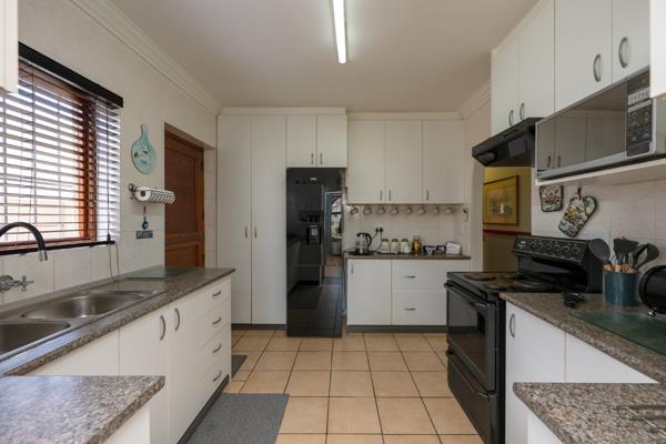 The charming open-plan lounge and dining area features tiled flooring and large windows that let in an abundance of natural light, creating a warm and welcoming environment. The kitchen is well-sized and functional, offering ample cupboard space, a freestanding stove and tiled flooring, ideal for everyday family living.
