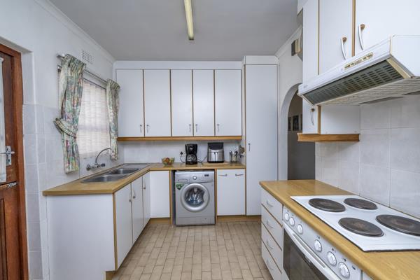 The kitchen is functional and fitted with built-in cupboards, a stove, oven, and extractor fan, with space for a washing machine providing a solid foundation for future upgrades.