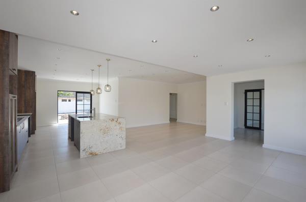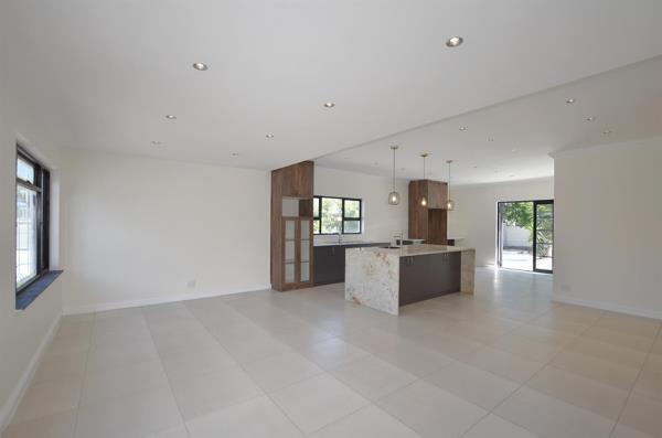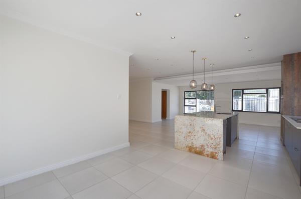 The home features a spacious open-plan entertainment area combining the lounge, dining area, and contemporary kitchen. The kitchen is fitted with a large centre island, perfect for casual dining and entertaining. Large-format tiles flow throughout the home, creating a clean and modern aesthetic.
