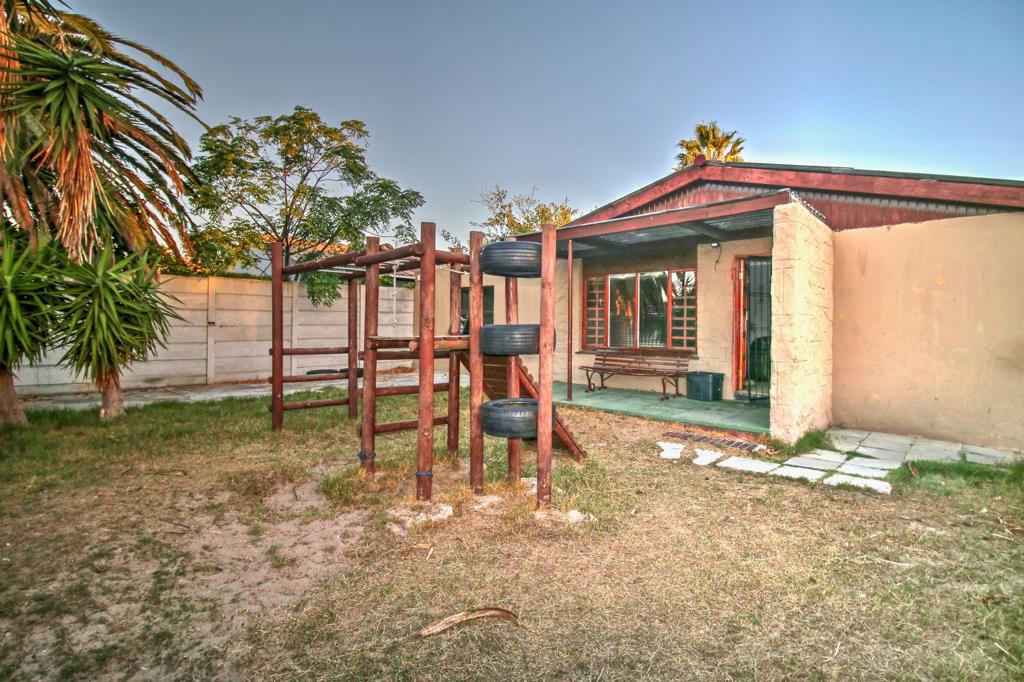 The property features a spacious paved driveway with parking for multiple vehicles, a child-friendly yard with a play area, and secure boundary walls with a gate and alarm system.