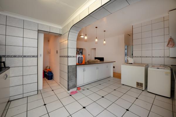 Step into a bright, open-plan kitchen and lounge area, designed for both functionality and comfort. The kitchen is tiled from floor to ceiling and includes a convenient storage room or pantry, making organisation effortless.