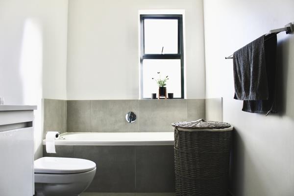 Opposite the shower, a built-in bathtub is set against a stylish grey-tiled wall, providing a relaxing retreat for unwinding after a long day. A well-placed window allows natural light to flood the space while maintaining privacy, and a chic plant adds a refreshing touch of greenery. A wall-mounted towel rail and a woven laundry basket contribute to the bathroom''s convenience and organisation.
