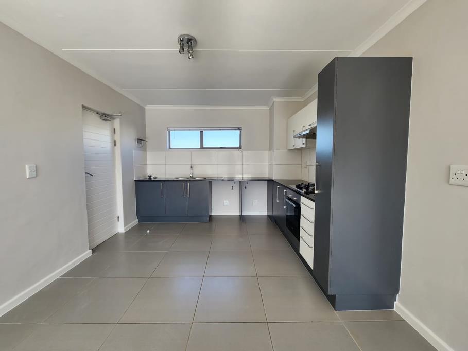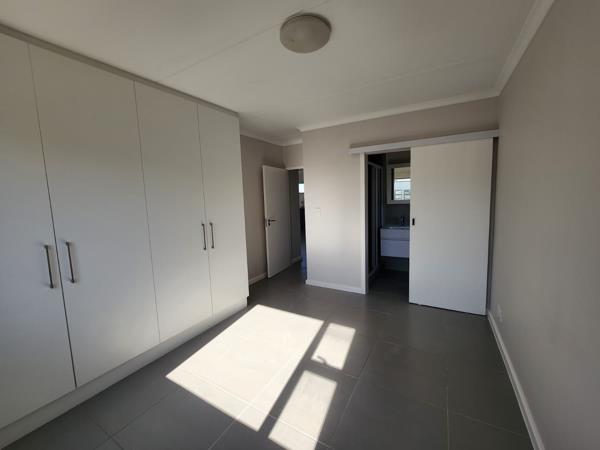 The spacious living area is tiled throughout and leads to a spacious private North-facing balcony with a build in Braai.