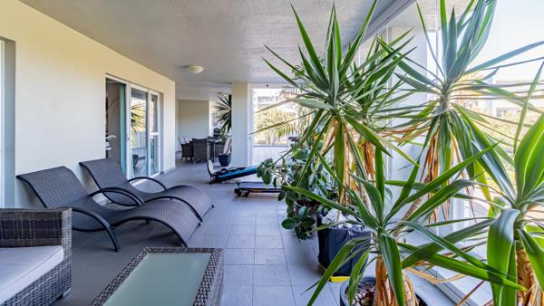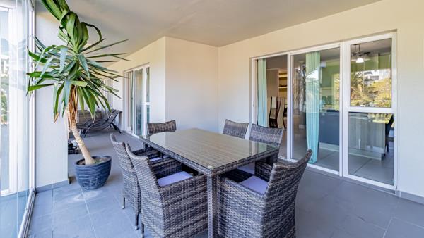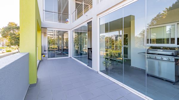 The bright and airy living and dining area seamlessly flows into an enclosed balcony fitted with stackable glass doors, providing a versatile space for braais, entertaining, or a secure play area for children.