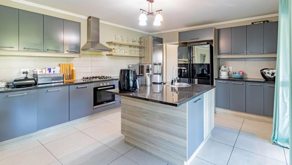 The open-plan kitchen is a culinary enthusiasts dream, featuring granite countertops, ample cabinetry and shelving, and a spacious scullery with three water points. It is equipped with a Bosch gas hob, oven, and extractor fan - perfectly suited for hosting or preparing gourmet meals.