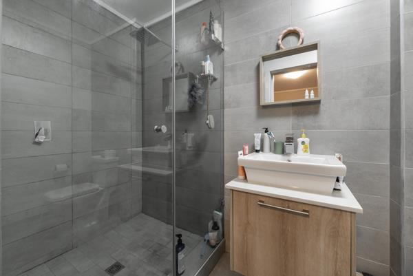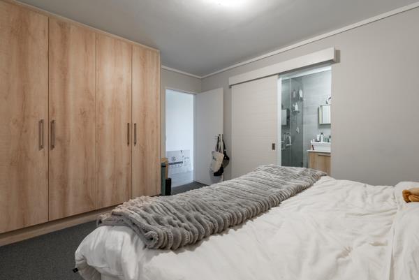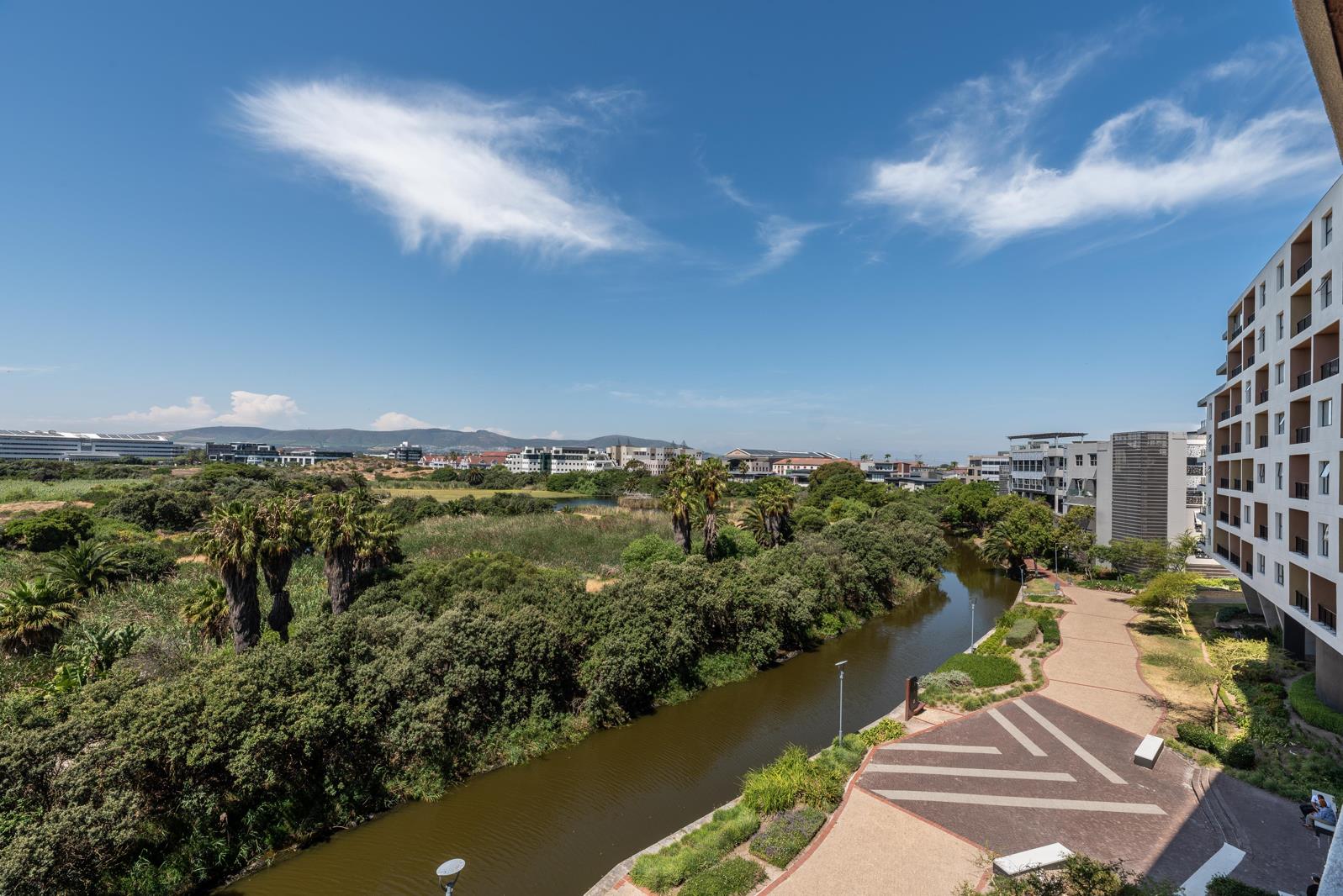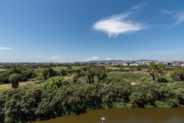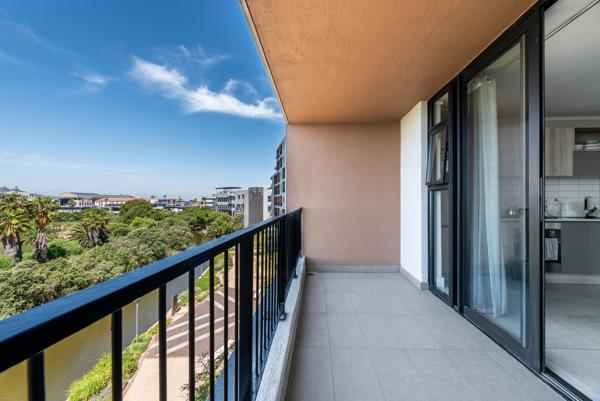 The open-plan living area flows effortlessly onto a generous balcony, perfect for relaxing or entertaining while taking in tranquil canal views and the abundant birdlife that frequents the nearby Intaka Island Nature Reserve. Natural light fills the space throughout the day, creating a warm and inviting atmosphere.