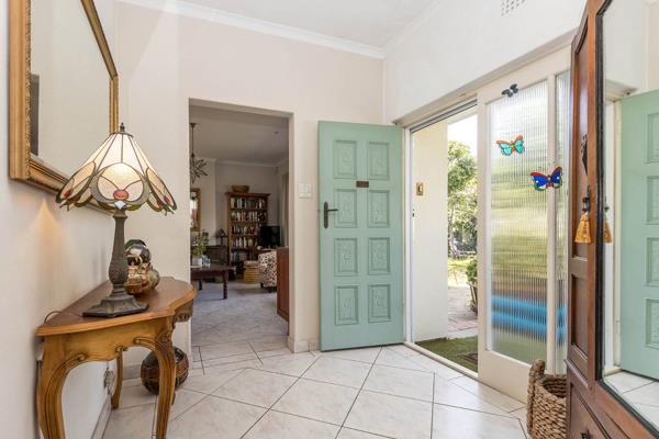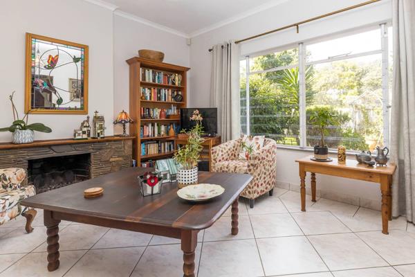 A spacious lounge with a working fireplace and a picture window overlooking the front garden flows into a bright sunroom, opening directly onto the swimming pool and the garden.