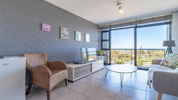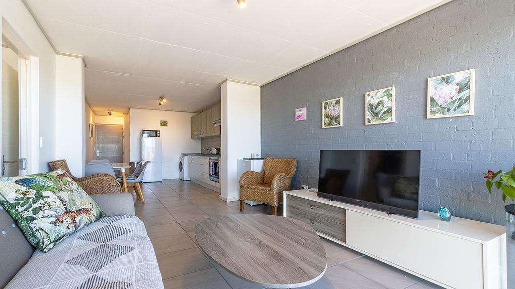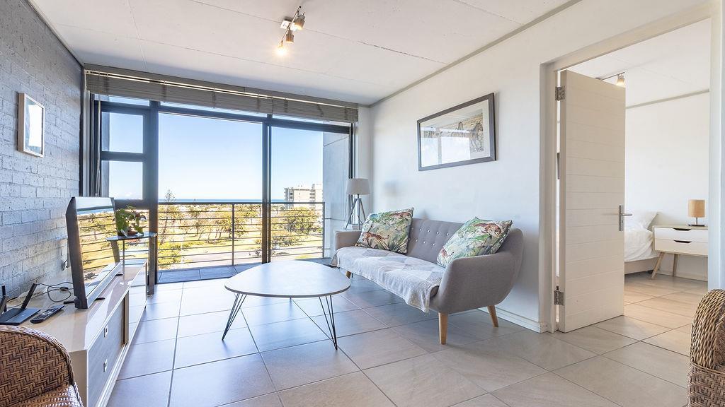 The open-plan living area flows to the balcony that offers a stunning view of the ocean and Table Mountain.