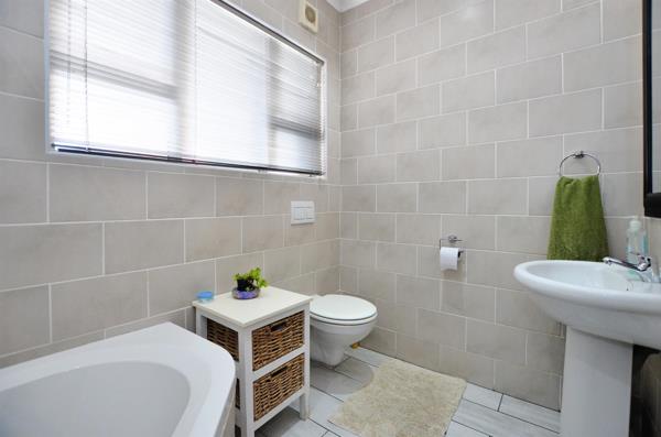 The home offers a well-appointed family bathroom, tiled floor to ceiling in neutral grey tones, featuring a corner bath and shower combination with a stack back glass divider, single basin, and toilet.