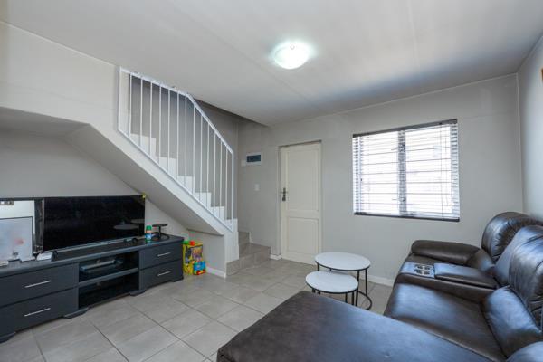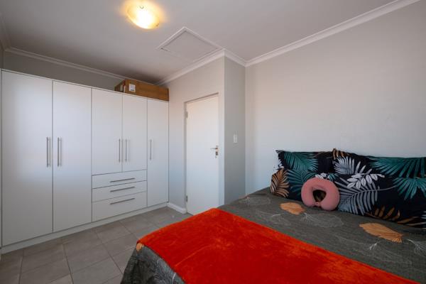 The property features 2 bedrooms and 2 bathrooms, with both bedrooms located upstairs and fitted with built-in cupboards. The layout provides good separation between living and sleeping areas.