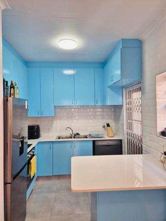The entire space has been newly tiled, creating a fresh and clean aesthetic. The open-plan lounge and dining area create an inviting area with a newly renovated kitchen equipped with a gas hob and space for a dishwasher.
