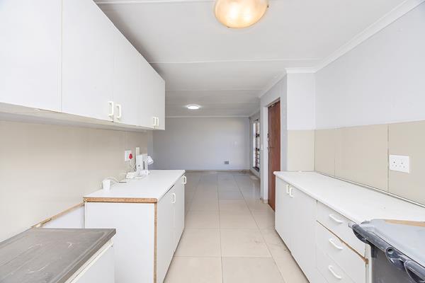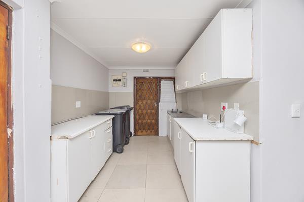 The kitchen is fitted with cupboards and a basin.
