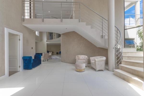 Triple-volume entrance hall with curved staircase and ambient lighting