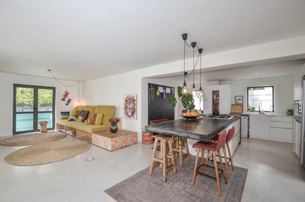 A double-volume entrance leads into an open-plan kitchen, dining and lounge area with a wood-burning fireplace and stacking doors to the garden. A large dining room enjoys pool views, while a separate playroom can serve as a fifth bedroom. An additional multi-purpose room is perfect as a gym, studio or storage space for beach and kite gear.