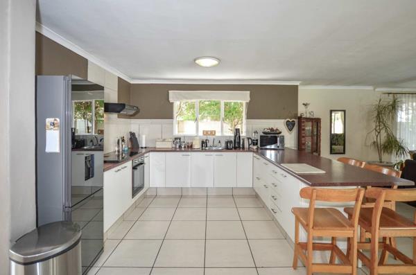 This solid and fabulous double story home is set on a sunny corner plot and offers many options for a family. Its a very large and unique multi functional home offering a total of 6 bedrooms, 7 bathrooms, 5 reception rooms, 3 garages and 4 parking areas in driveway. The main house has a lovely L shape flow, offering the comfort of no steps, great space, sun and wind free entertainment. A large open plan flow kitchen and dining area lead to the wind protected pool and north facing garden area. Great for entertainment and kids and dogs to run free. There is a separate TV lounge leading to the passage that access all the bedrooms. All 4 bedrooms are en-suite and spacious in the back wing of the home away from the entertainment rooms. The one bedroom wing also has an enclosed sun room area which is lovely.