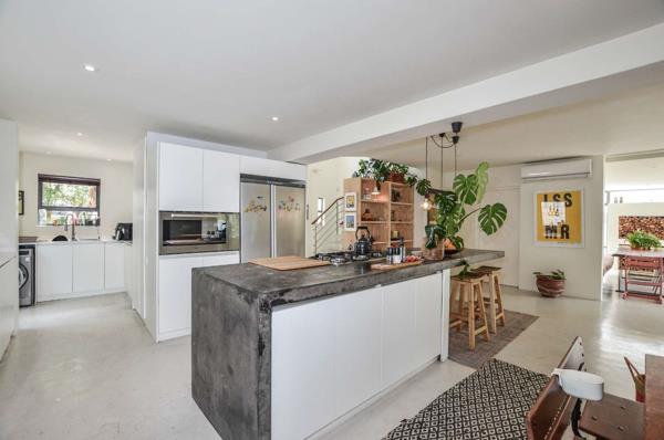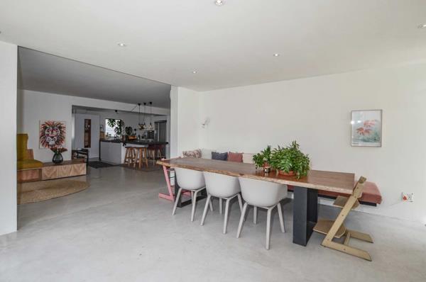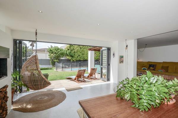 A striking double-volume entrance leads into the heart of the home a spacious open-plan kitchen and dining area that flows into a large, sunlit lounge with a built-in wood-burning fireplace and stacking doors opening onto a lush, private garden. There is a large dining room with views of the garden and pool as well. A separate playroom to the right of the kitchen offers flexibility as a potential fifth bedroom, and an additional large room is ideal as a home gym, studio, or storage space for surf and kite gear.