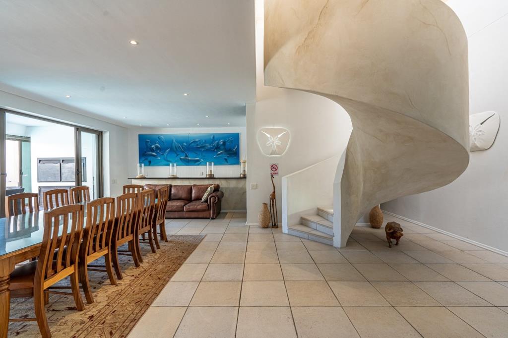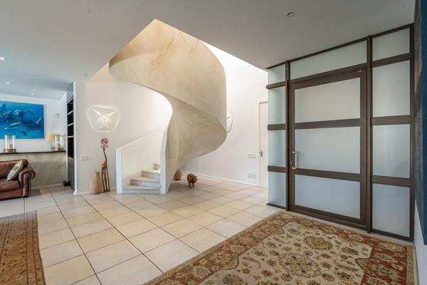 Step through the grand entrance into a light-filled space where a sweeping designer spiral staircase with in-stair lighting becomes the sculptural heart of the home. The open-plan lounge, dining, and kitchen areas unfold effortlessly towards the garden, with glass stacker doors and secure custom shutter systems allowing the entire living space to open to the pool, jacuzzi, and entertainment deck a true entertainers dream.
