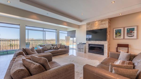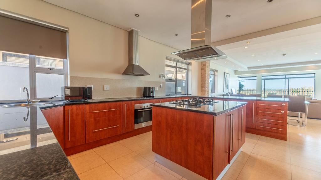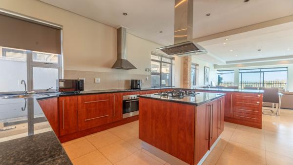 Downstairs you enter into an expansive living room onto the covered patio with built in braai. There is a second adjoining living room and dining room with direct flor to the large open plan kitchen with center-island. Separate scullery and storeroom lead directly into the garage.