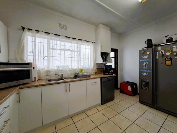The kitchen is a standout feature, offering ample space and practicality. Fully tiled and fitted with built-in cupboards, a gas hob, double basins, and a connection point for a dishwasher, it is designed to make meal preparation both convenient and enjoyable.