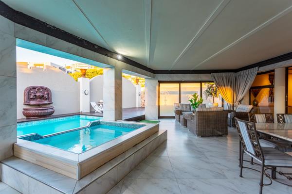 The outdoor spaces are crafted for leisure, offering a sparkling pool, relaxing jacuzzi and a cozy boma perfect for year round gatherings. Children and pets enjoy generous garden space thanks to the property rare status as the largest erf within the prestigious estate.