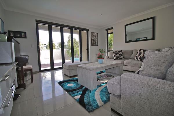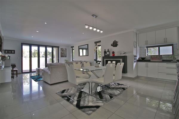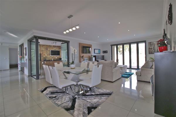 The ground floor boasts spacious open plan living areas and entertainment areas with stacking doors opening onto the garden, pool and outside braai, guest bedroom, and two garages with ample gated parking.