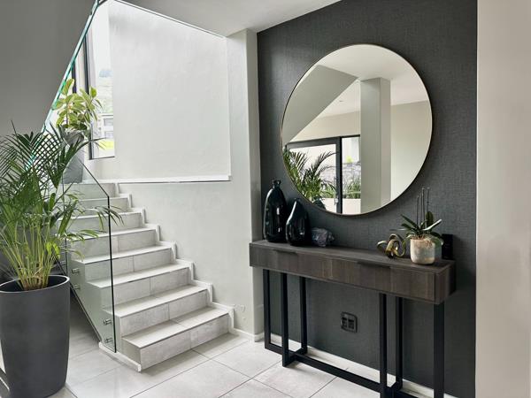 Its impressive floor coverage comprising of four bedrooms all en-suite, cinema room, study/library, open plan living areas which include two lounges and a dining area, designer kitchen (with separate scullery), outside entertainment and braai, landscaped garden, six garages, and ample parking for additional vehicles and visitors.