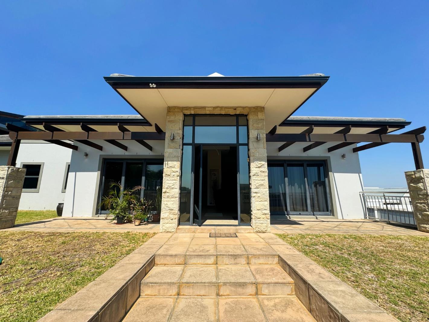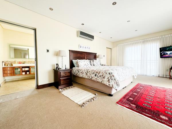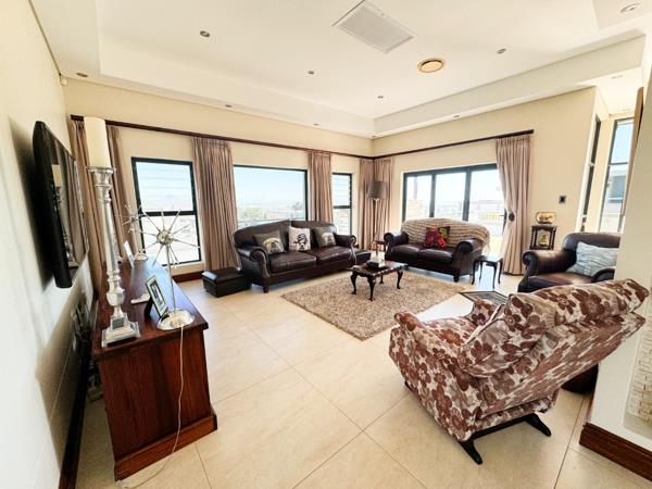 Outdoor Retreat: A private courtyard hosts a wind-shielded entertainment area complete with a sparkling pool, an indoor braai, and a jacuzzi for relaxation. A guest cloakroom ensures convenience during gatherings.