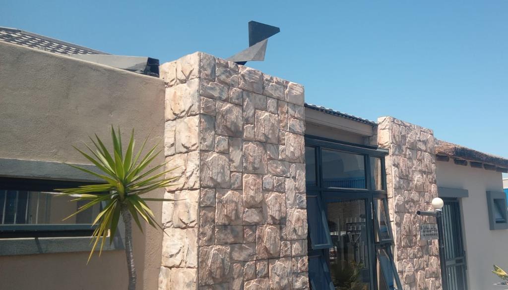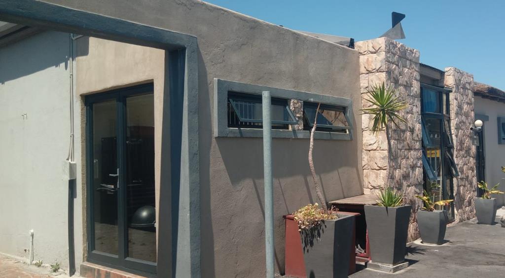 Discover this contemporary residential property for sale in the desirable suburban enclave of Glenlilly, Parow, South Africa. This home presents a striking kerb appeal, blending modern design elements with practical features. The exterior showcases a sophisticated mix of dark-framed glass doors and windows, textured plaster walls, and distinctive rustic stone cladding, creating a unique aesthetic. An integrated mailbox adds to the clean frontage, while security bars on windows provide enhanced peace of mind.
