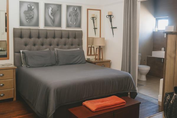 The residence comprises three comfortable bedrooms and two well-appointed bathrooms. The bathrooms feature a modern floating sink and toilet, complemented by light grey tiled walls, an exposed brick accent, and earthy-toned floor tiles. Natural light enhances the space, and an accessibility grab bar adds convenience.