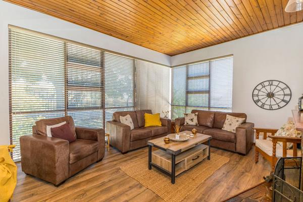 Externally, the property features a double garage and a long tarred driveway, providing generous off-street parking. The front garden, with its mature shade trees and established beds, offers a welcoming entrance, though the lawn may benefit from some attention. The stone-paved porch with a built-in planter adds to the kerb appeal, complemented by security bars on the windows for peace of mind.