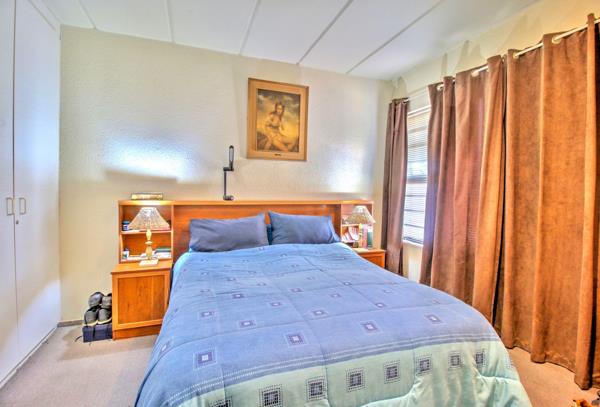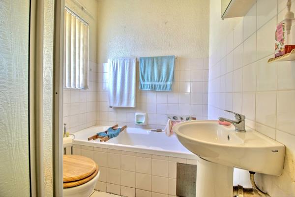 The main bedroom is spacious with lots of cupboard space. The bathroom is fitted with a shower, bath, basin, and toilet.