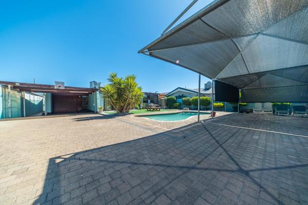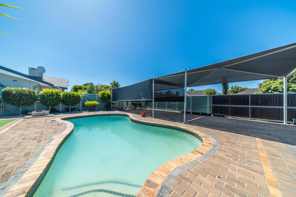 The main bedroom offers ample built-in cupboards and pool views, with a full en-suite bathroom including a spa bath, double shower, and double basins. Two additional bedrooms are serviced by a separate bathroom and guest toilet.