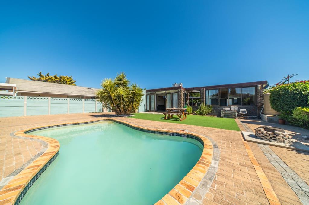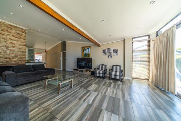 The main house features a large open-plan TV and living area with fireplace, opening via sliding doors to a sparkling swimming pool and garden. The open-plan kitchen flows into the living spaces, with a separate dining and braai room leading to the backyard.
