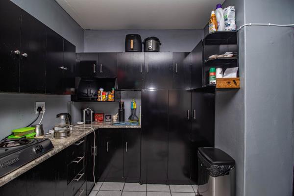Enjoy a practical and stylish kitchen with sleek black built-in cabinets and sufficient countertop space, making meal preparation easy.
