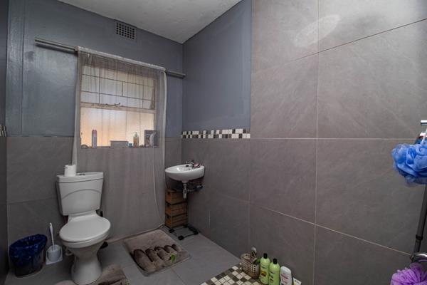 Recently updated with modern grey tiling, featuring a clean basin, toilet, and a large, accessible walk-in shower with distinctive mosaic floor accents.