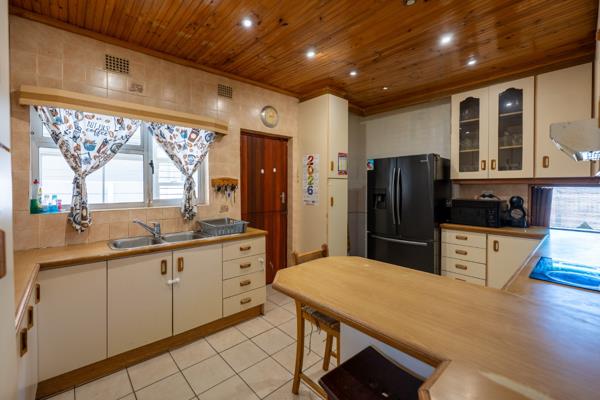 The fully enclosed property welcomes you with a large lounge featuring high wooden ceilings and expansive windows that flood the space with natural sunlight, creating a warm and inviting atmosphere. The kitchen is well-equipped with ample cupboard space, a fitted stove and oven, and room for a double-door fridge, making it both practical and functional for family living.