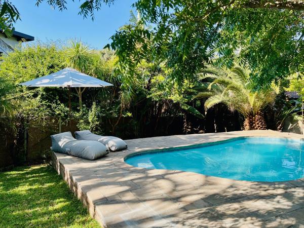 Step outside onto a covered patio with a built-in braai, then wander into the lush garden with a swimming pool secured by a sturdy safety cover. The exquisite garden is adorned with a variety of fruit trees.